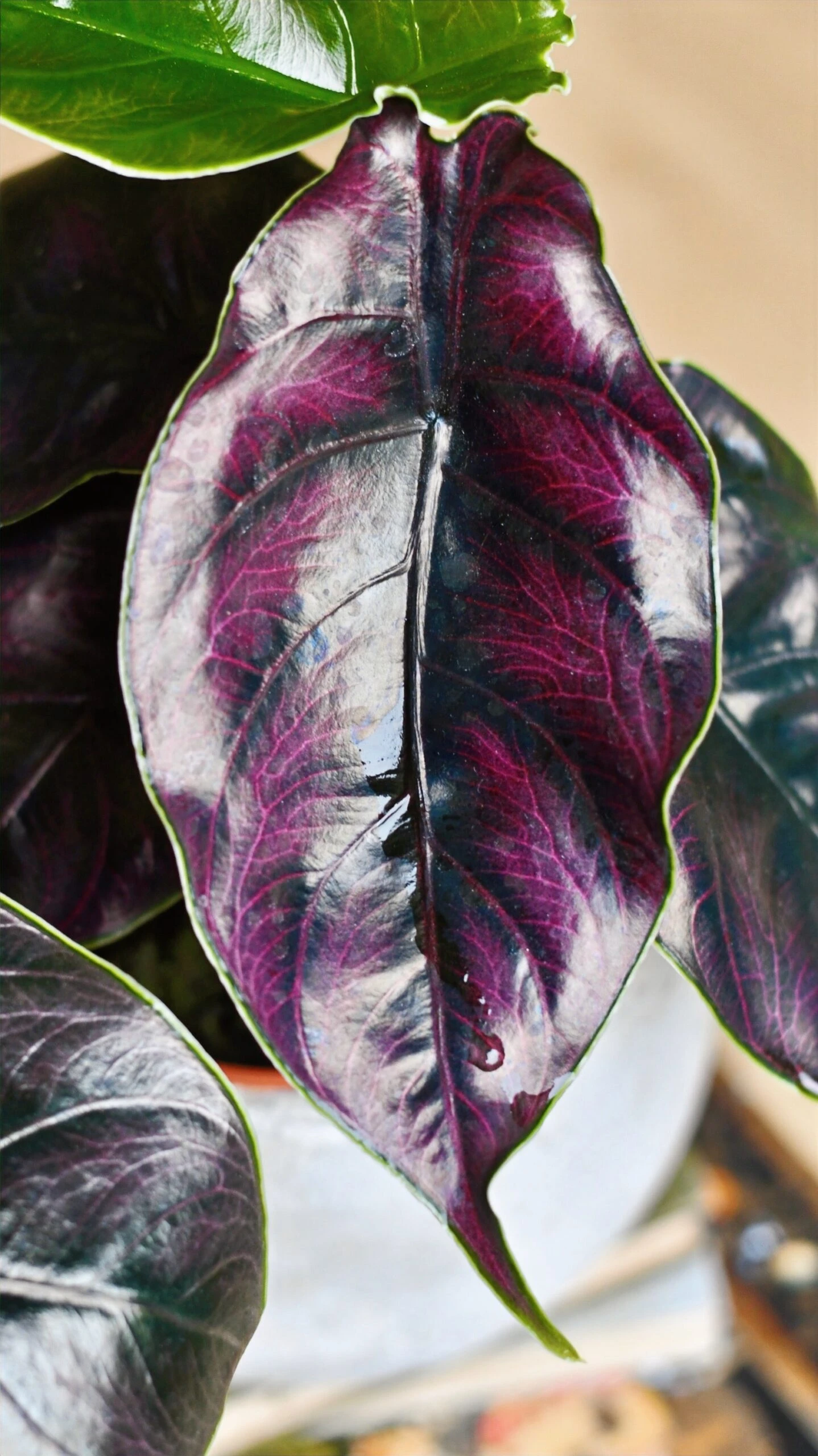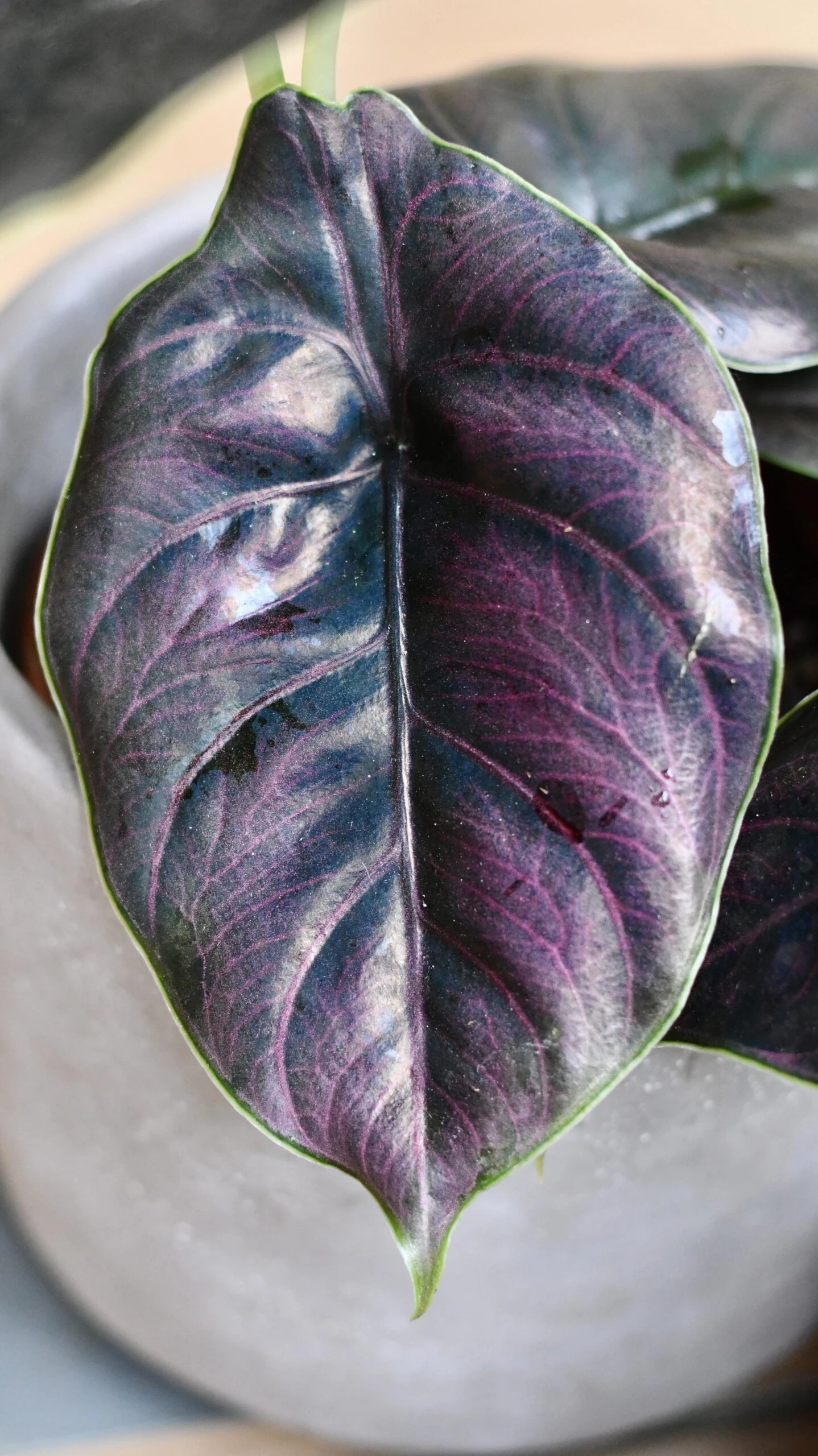 New leaves will slowly unfurl and are green with purple veins that turn waxy, deep iridescent green with dark purple veins with a beautiful green outline, and a purple underside.Â