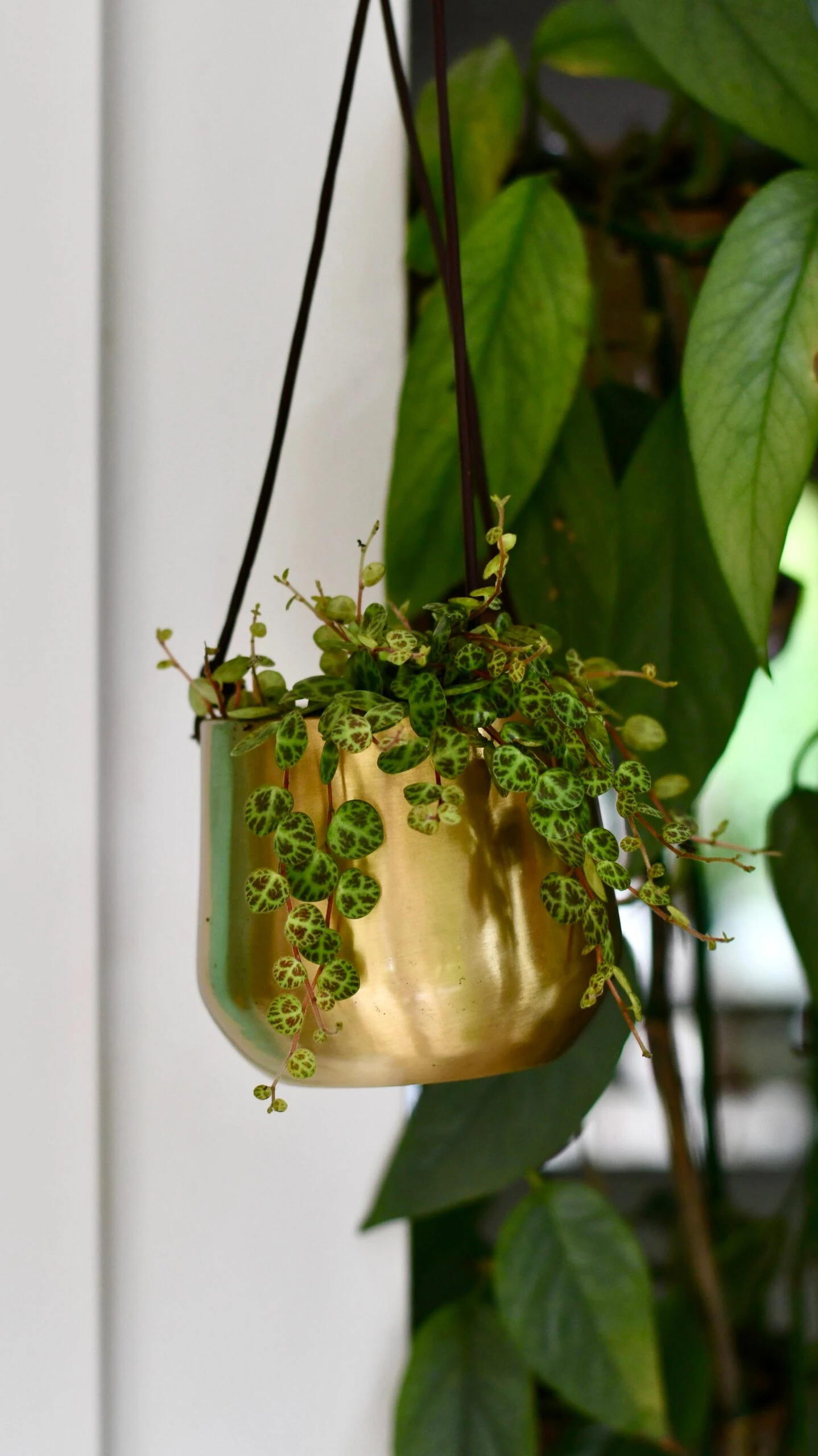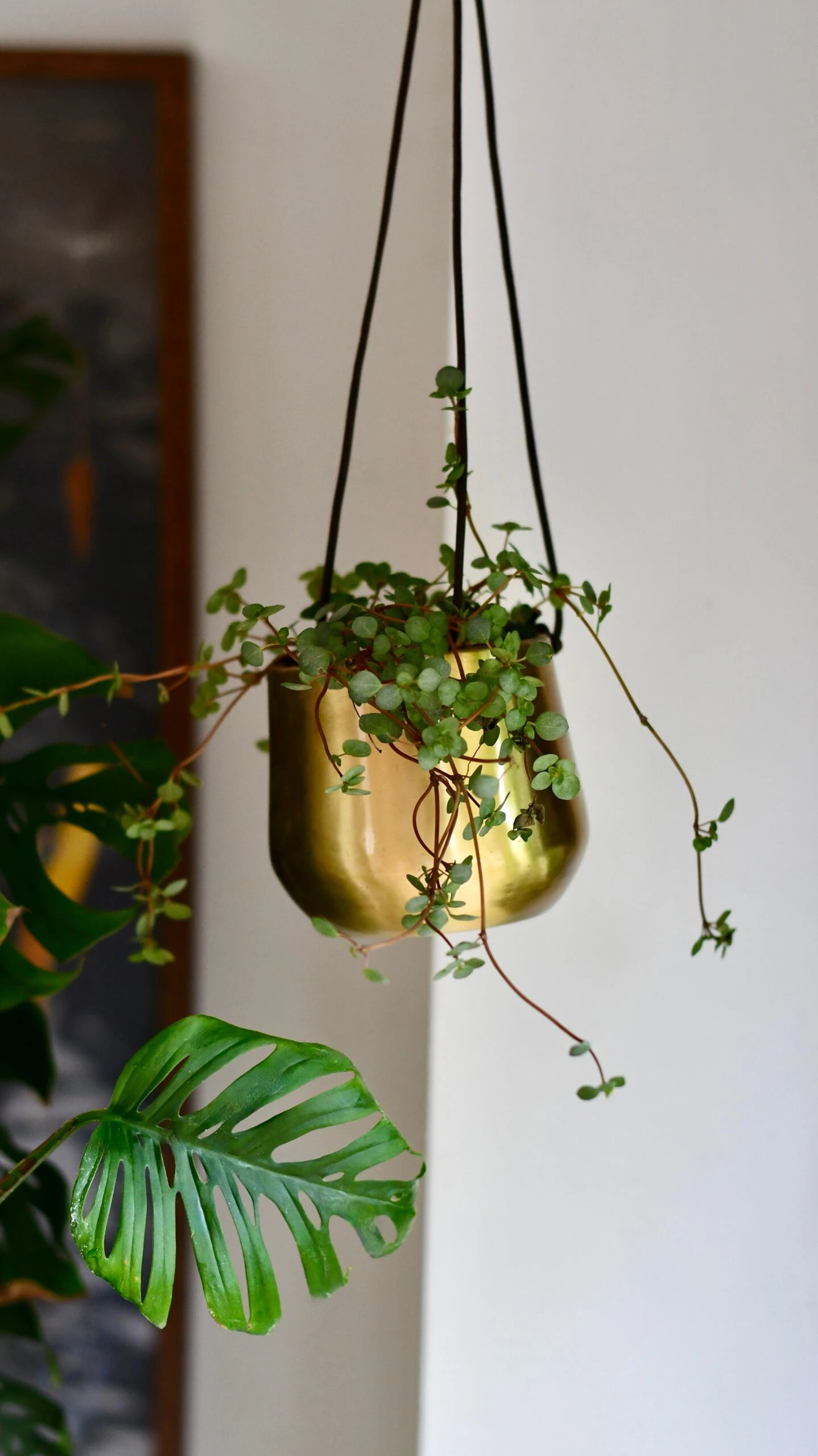 The golden hues of brass of our Atsu planters really extenuate the smooth contours of this elegant hanging pot. The brass is a striking back drop against green foliage making an eye -catching combination. Each planter is hung with leather ties.