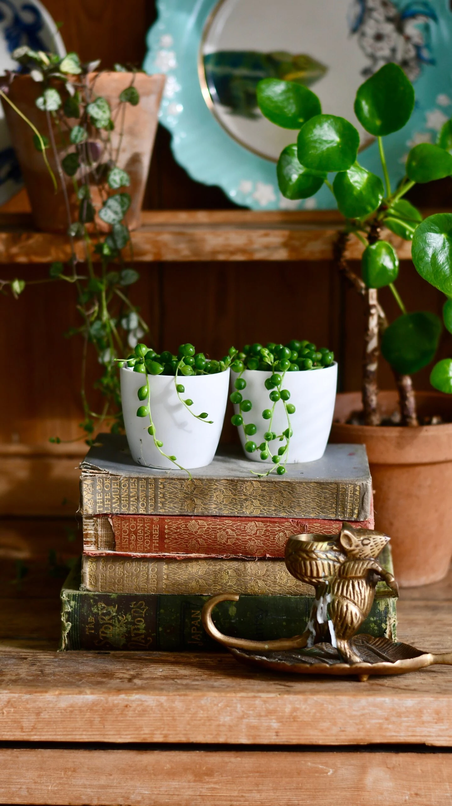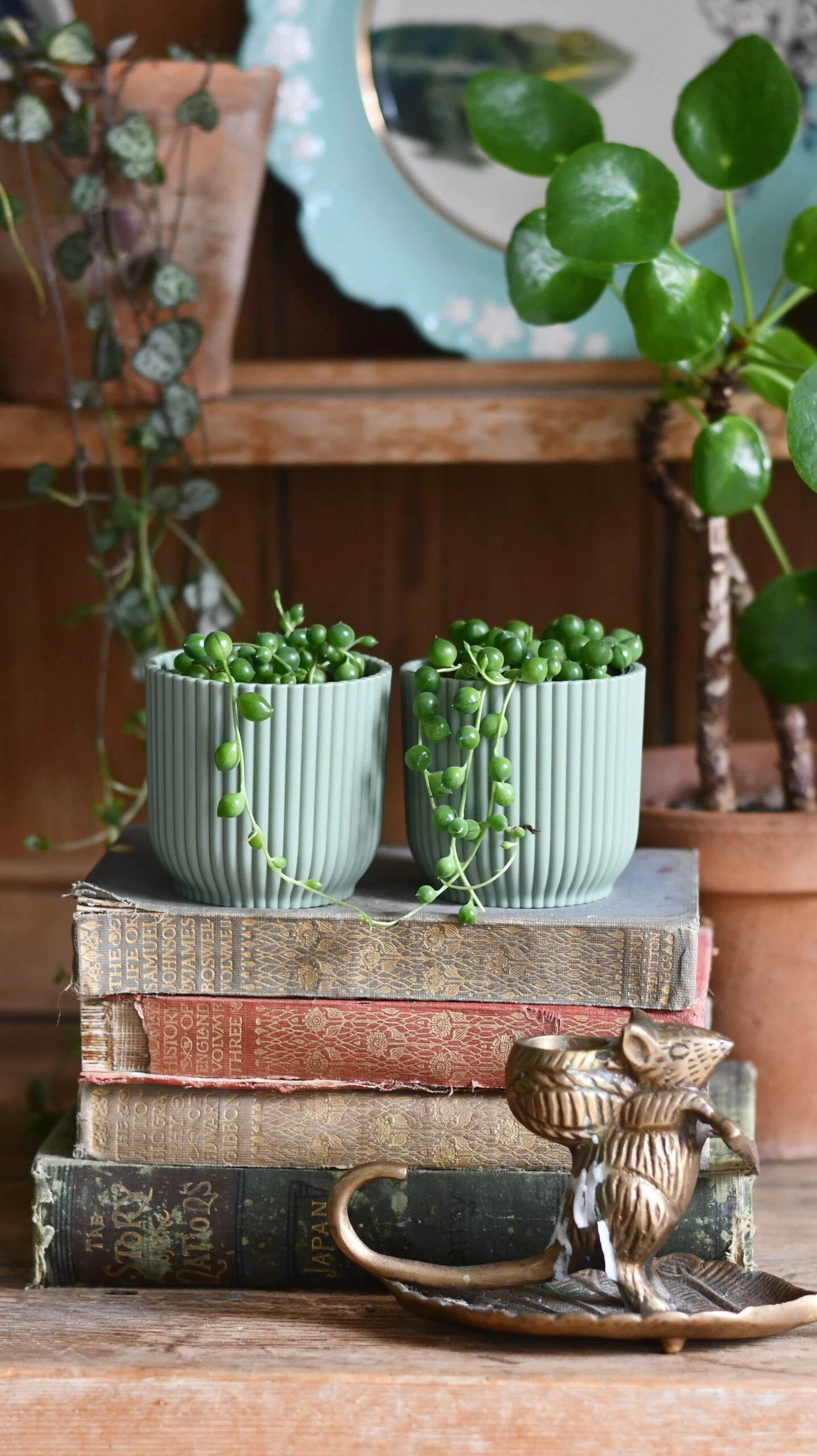 To style the String of Pearls, consider pairing it with plants that have a contrasting texture, such as a plant with broader leaves or a different colour foliage. The plant also pairs well with natural materials, such as wood or woven baskets, which complement its earthy tones.
