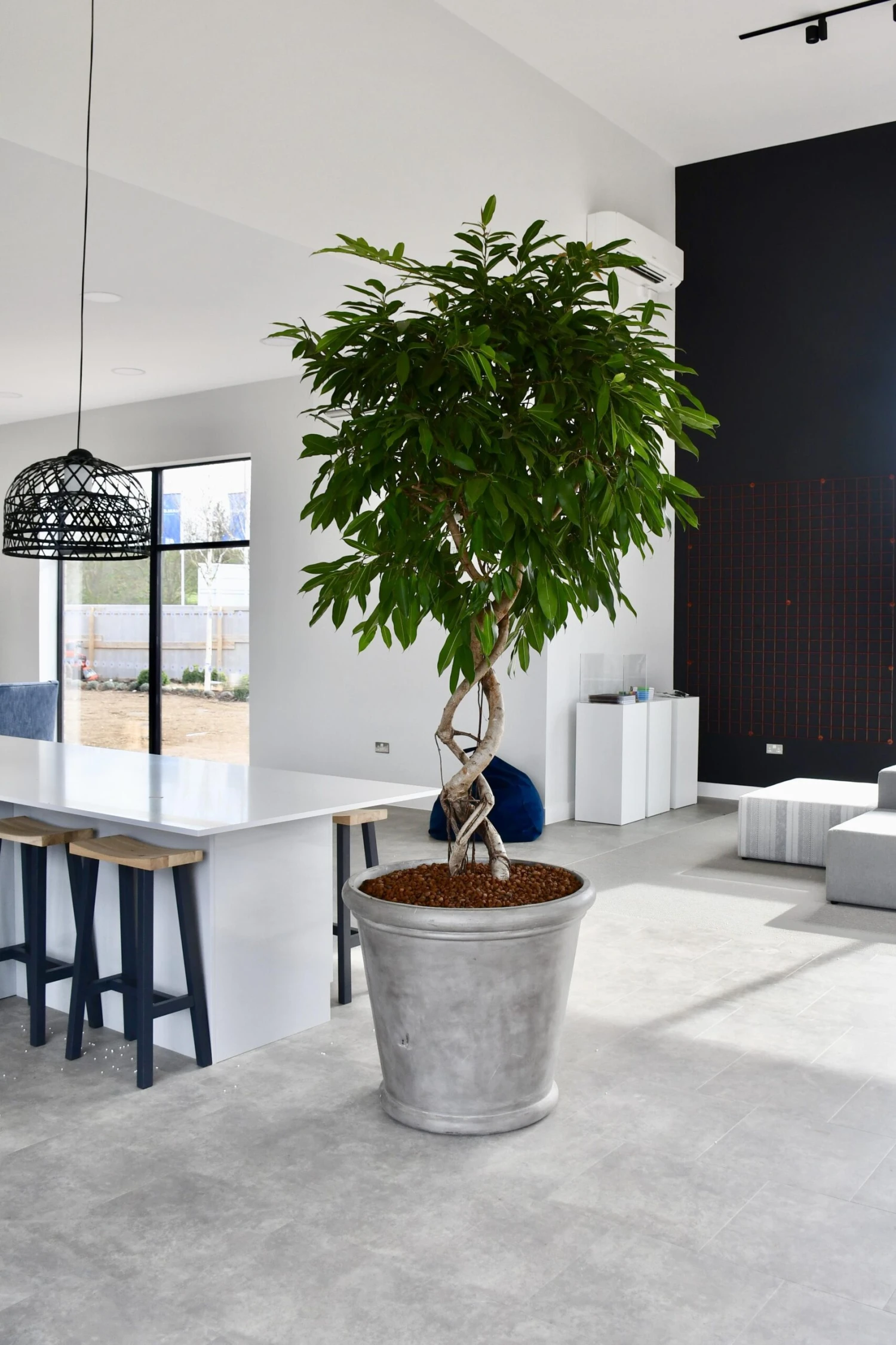 Our Ficus Amstel King is two and a half metres tall so it will work well if you have a big space – with a high ceiling. Please call to chat about your requirements if you have a space that needs an impressive focal point.