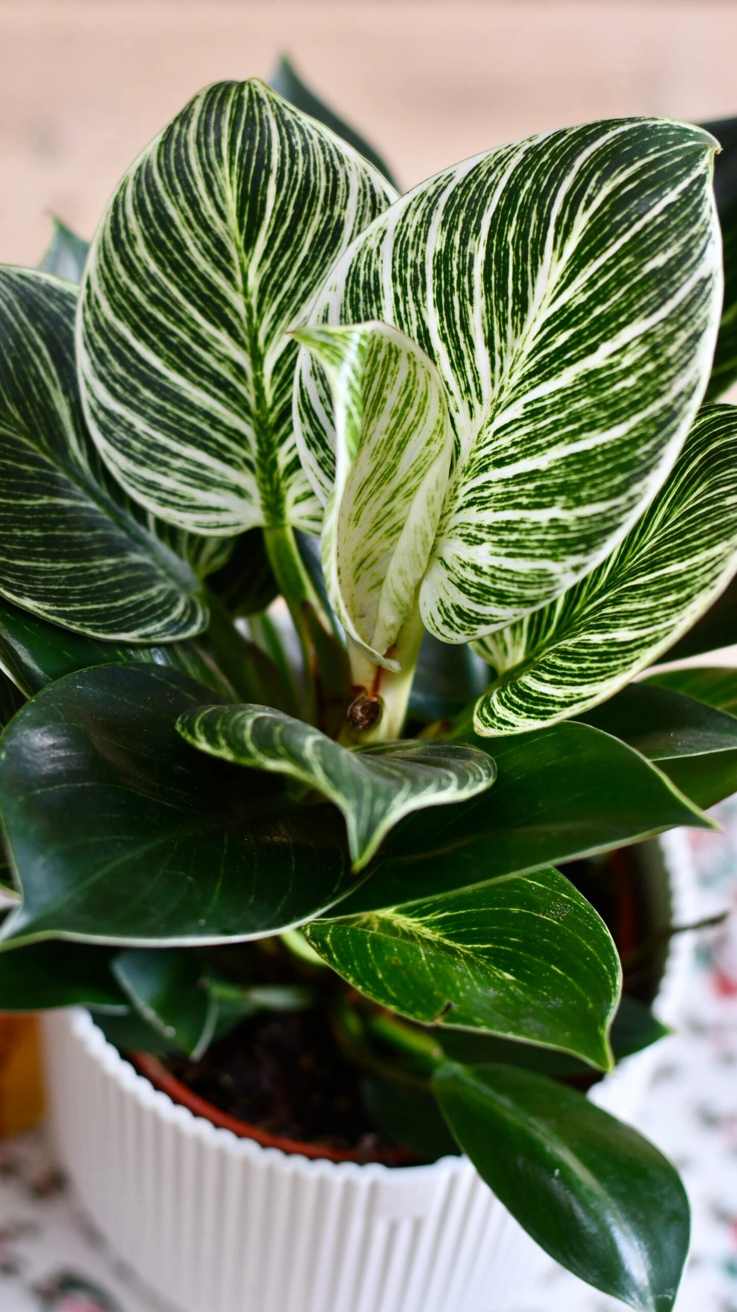 We love the rainforest style of this lovely Philodendron Birkin Plant! Philodendron Birkin is a really lovely houseplant, displaying green leaves variegated with yellow. The Birkin plant brings a truly tropical feel to your rooms, giving your home the rainforest vibe!