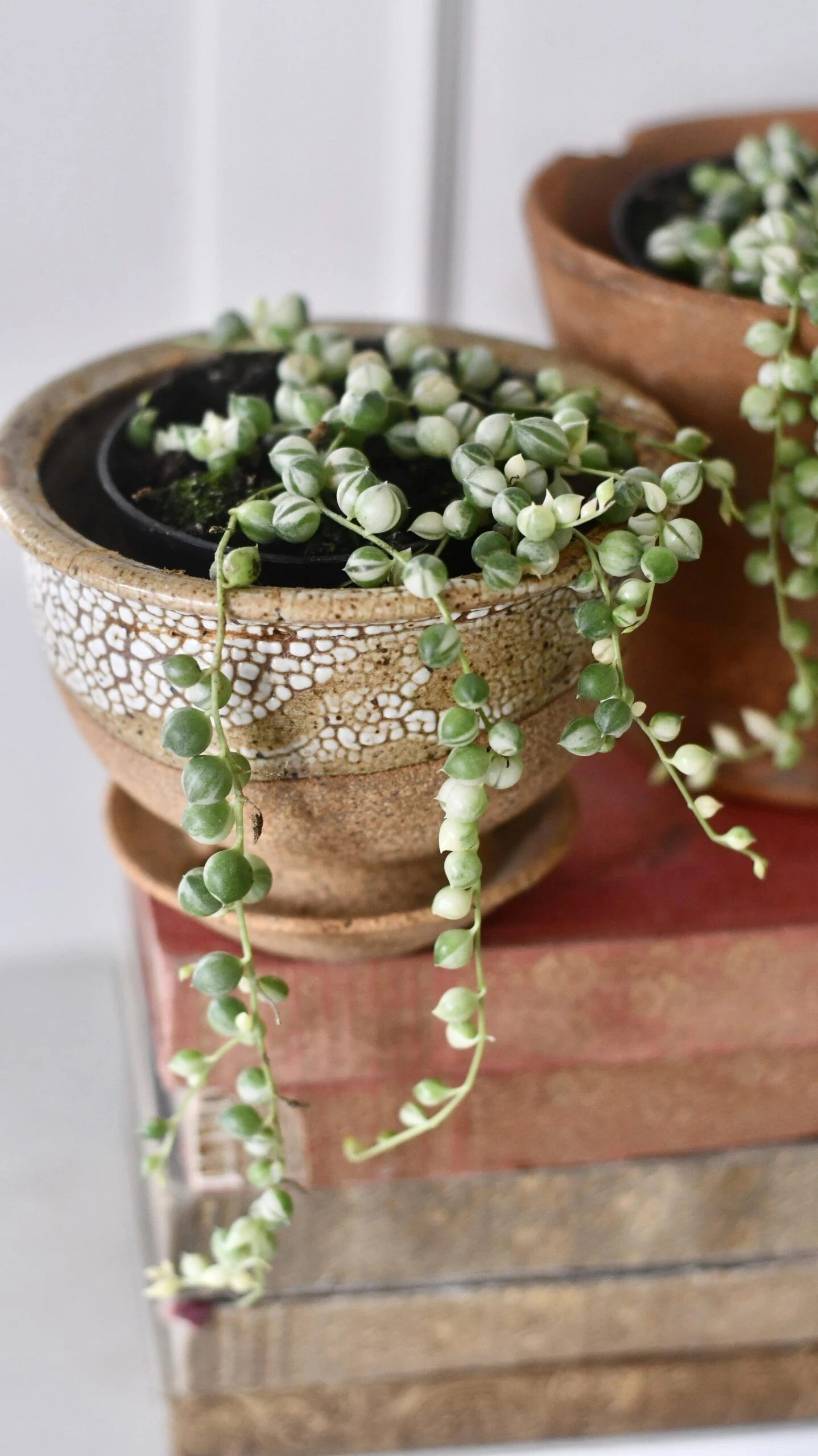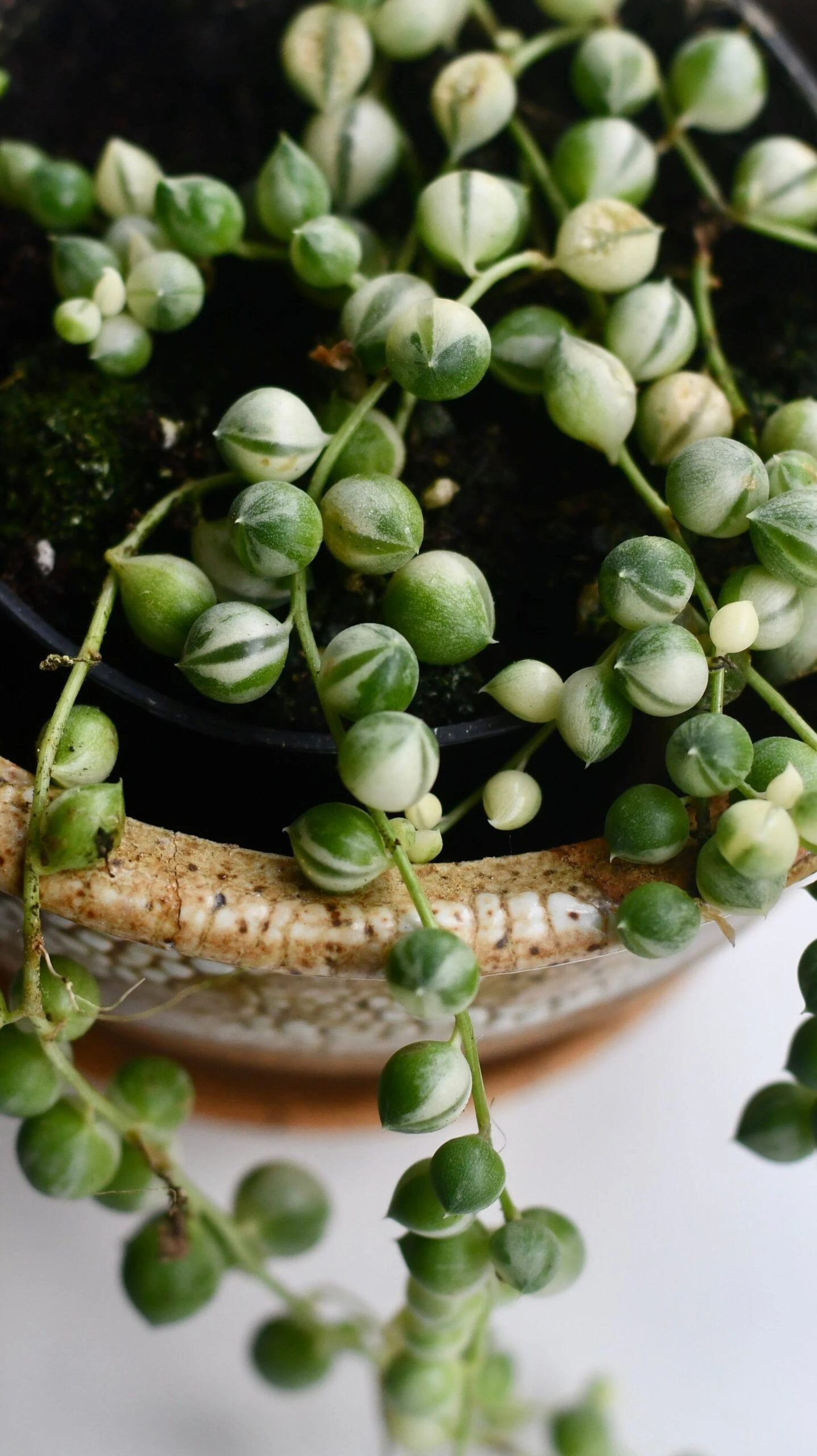 To create an appealing display with the String of Pearls, consider combining it with plants with contrasting textures, such as those with broader leaves or foliage of different colours. The plant also pairs well with natural materials such as wood or woven baskets, which complement its earthy tones.